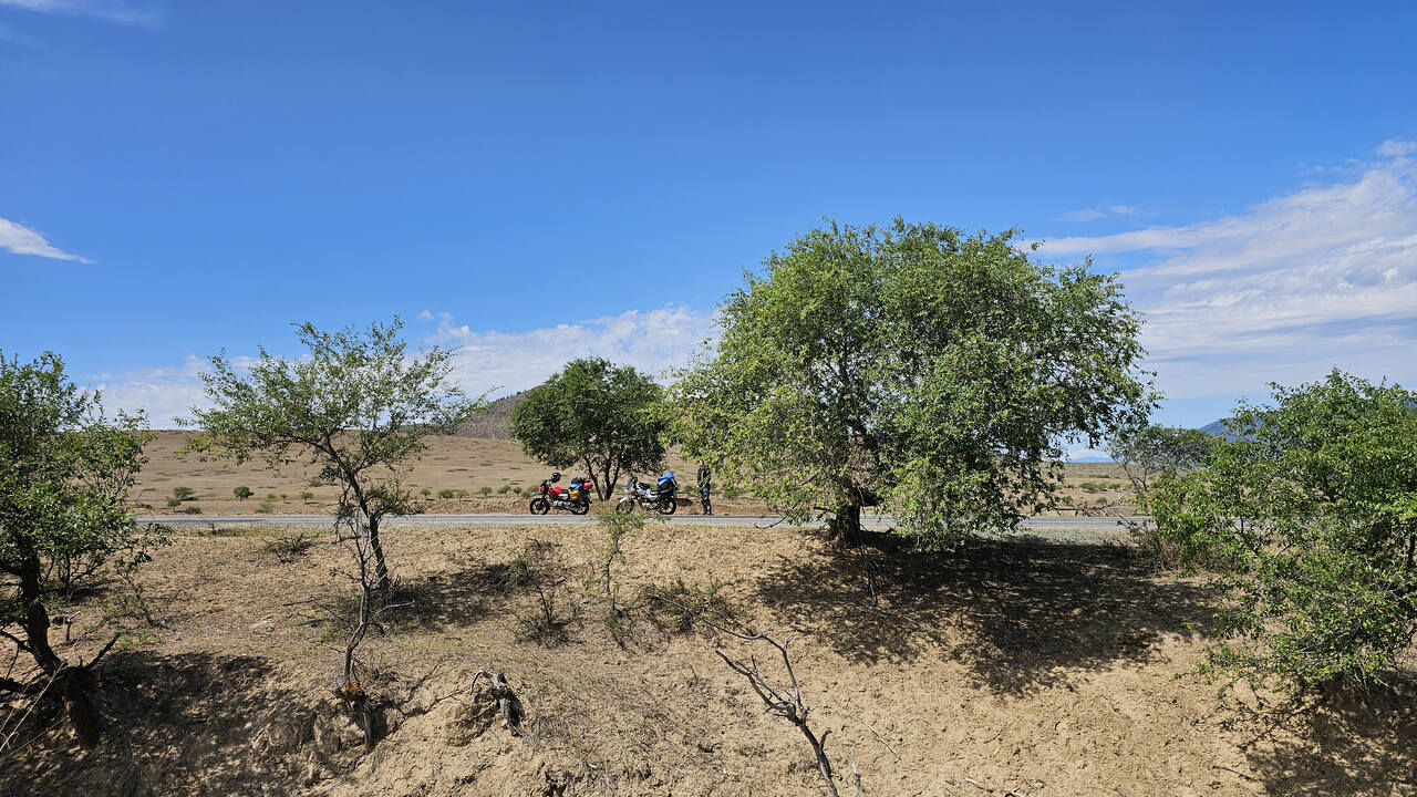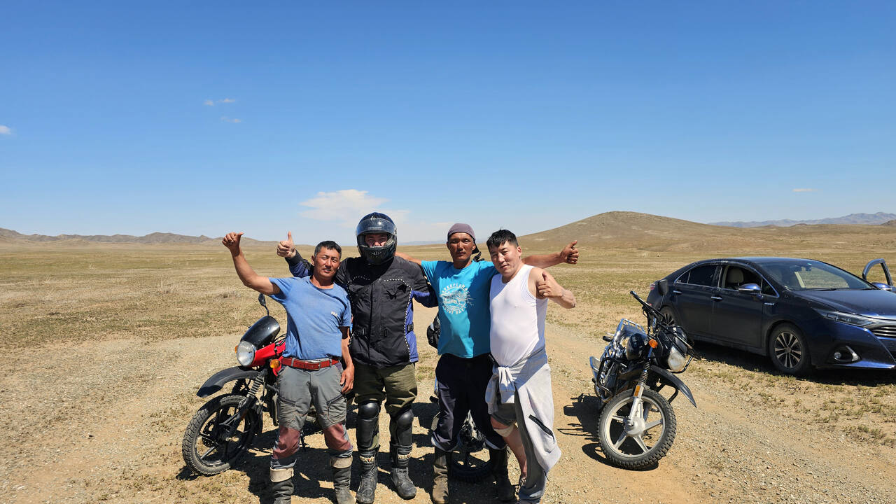 Стада на самовыпасе с собаками и другими пастухами, а они отдыхают, катаются, выпивают и развлекаются. Увидели двух путешественников, захотели познакомиться, предложить выпить и сфотографироваться. Мотоциклист в восторге от нашей экипировки, дает понять, что недавно он упал на мотоцикле и повредил ногу, желает нам быть осторожными в пути. От выпивки мы отказываемся по понятным причинам, фотографируемся на их телефоны, на свои, жмем друг другу руки и отправляемся дальше. Который раз удивляюсь, как люди могут общаться с пониманием, не используя язык.