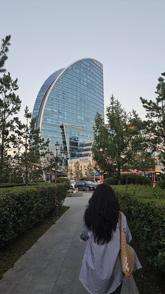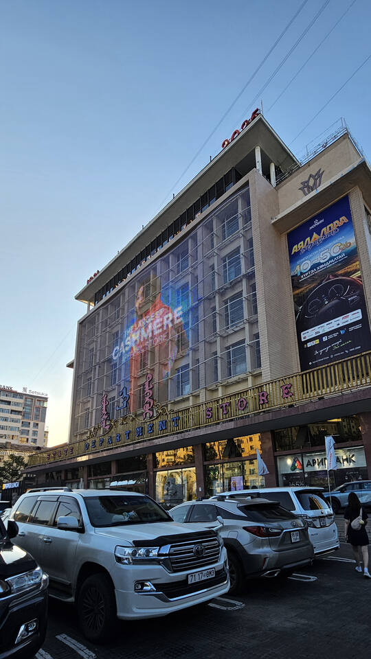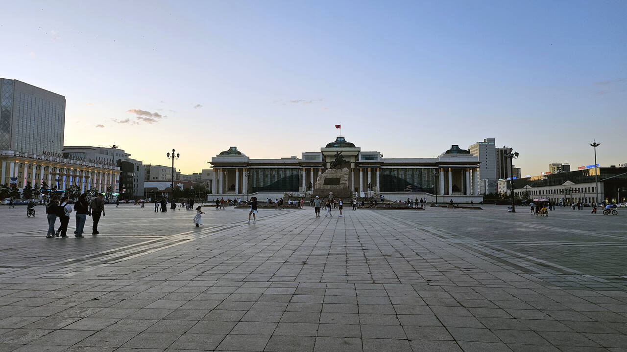 Подъезжаем к столице. Вкатываемся в субботний мегаполис с вечерними пробками. В пробках то и дело нас приветствуют на русском языке. Сегодняшняя цель – поселиться в гостинице как можно ближе к центральной площади, чтобы погулять по центру города, посмотреть на городские пейзажи, горожан, главную площадь страны. Не сразу это удается. Из навигации – MapsMe с обновленными картами региона. С третьей попытки удается найти свободные места в гостинице в квартале от главной площади и в трех кварталах от большого торгового центра. Поставив мотоциклы у крыльца гостиницы, разгрузившись, отправляемся в торговый центр. Я не взял с собой никакой обуви, кроме мотобот, и у напарника нет прогулочной обуви кроме тапок, поэтому для прогулок нужно приобрести что-то подходящее. Тоже неплохая прогулка по вечернему городу. Торговый центр со всеми необходимыми брендами. Подходим к одному из стендов с летней обувью, ценников нет, зовем консультанта – молодая девчонка, по-русски, естественно, не понимает, но довольно уверенно общается на английском. Школьница – подрабатывает на каникулах. Поблагодарили и с обновками пошли обратно. Закинули вещи в гостиницу и пошли гулять по центру. Вечер, суббота, там и тут играет музыка, вокруг площади много кафе, зеленые прогулочные зоны, фонтаны, инсталляции. Через центральную улицу «Энхтайвны өргөн чөлөө» она же – «Проспект мира» высятся офисные многоэтажки с интересной архитектурой, слева – правительство города, справа дворец культуры и театр оперы и балета, а по центру – дворец правительства Монголии со статуями монгольских воинов и центральной фигурой Чингисхана. На ступени дворца подняться нельзя – время нерабочее, ступени отгорожены металлическими переставными барьерами, а на верхних ступенях прогуливается серьезного вида мужчина в гражданском костюме и темных очках. Сама площадь квадратной формы, согласно яндекс-картам 3,5 гектара. Примерно, как Красная Площадь в Москве от Исторического музея до храма Василия Блаженного без Васильевского Спуска.
