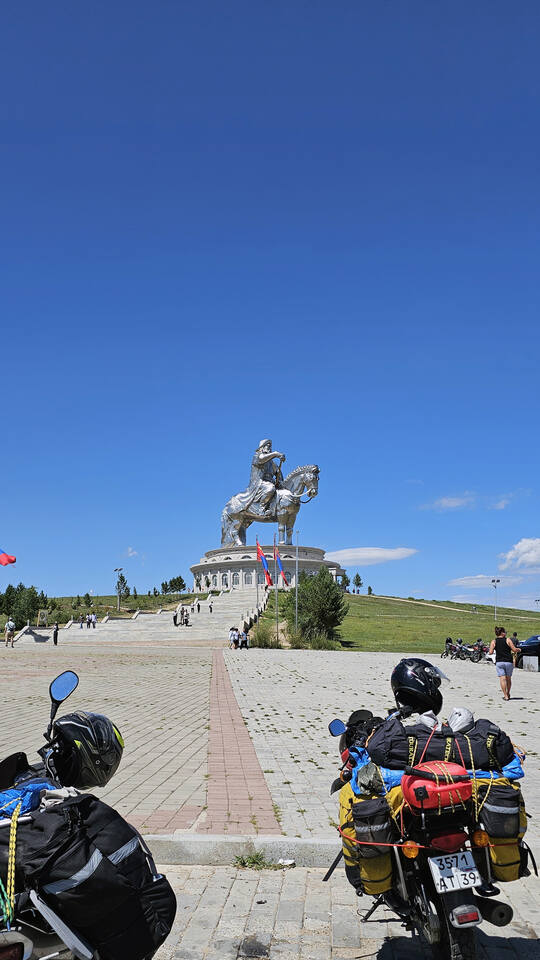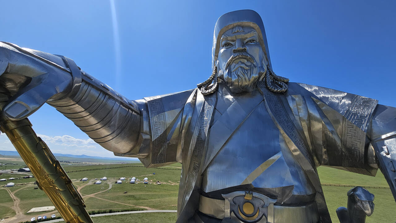 С очередного затяжного холма открывается прекрасный вид на долину, в центре которой возвышается сорокаметровая статуя Чингисхана на коне. Общая высота статуи всадника с постаментом – 50 метров. Изготовлена из нержавеющей стали весом 250 тонн. В постаменте расположена художественная галерея, музей, рестораны, сувенирные лавки. Внутри статуи есть небольшой лифт и лестница к смотровой площадке, которая расположена на голове лошади.