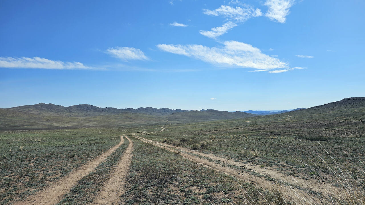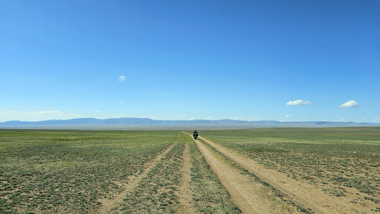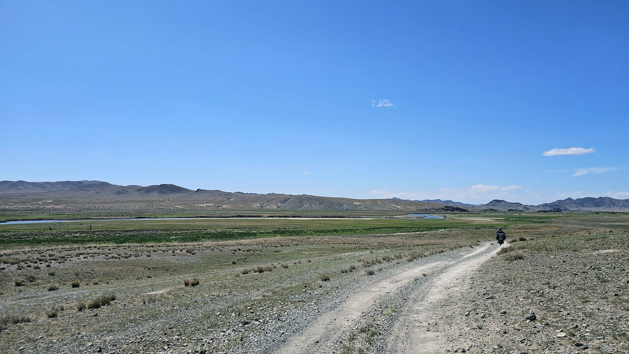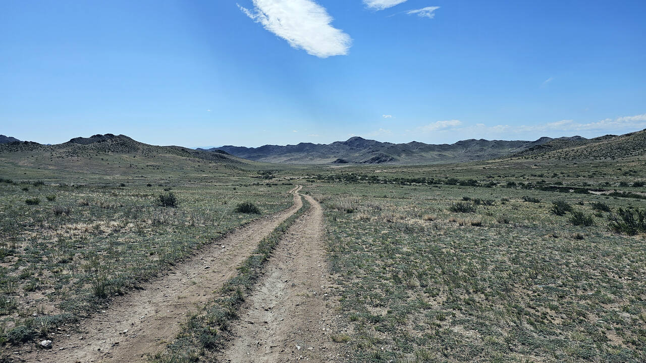 Перевалив через хребты, вкатываемся в огромную долину, на горизонте которой очень далеко у горизонта вздымаются очередные горные хребты. Долина вытянута на северо-запад. По центру – почти высохший приток главной реки страны. На другой стороне которого едва видится гравийная дорога, с которой мы вчера свернули. Приходится преодолевать эту долину поперек и искать брод через ручей. Сначала полевая дорога начинает исчезать, едва видимая, она упирается в стоянку пастухов, а дальше – ничего, петляем между кочек, потом преодолеваем небольшой брод и понемногу приближаемся к гравийке. Хорошо, что не было дождей, и мы с легкостью справляемся. Теперь наш путь лежит по федеральной грунтовке, которая местами разделяется веером на десятки путей, часть из которых сходятся обратно в одну, иногда вбирая в себя новые дороги с разных направлений. Причудливая сеть монгольских дорог.