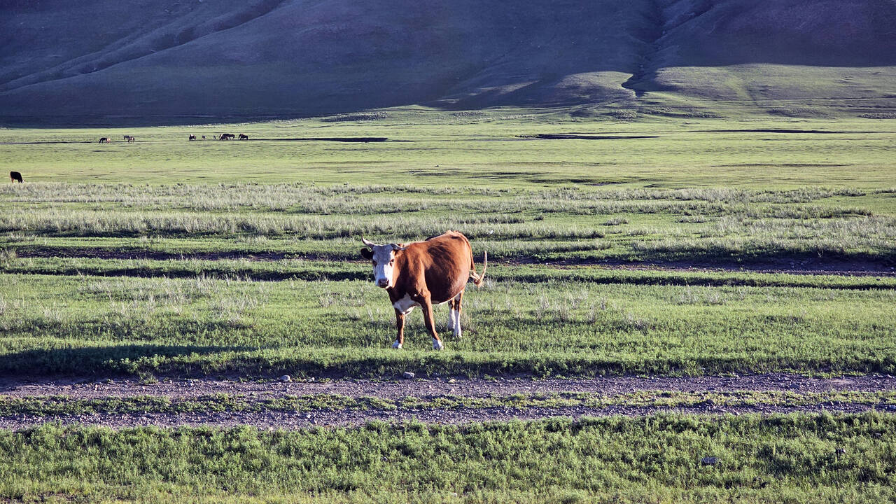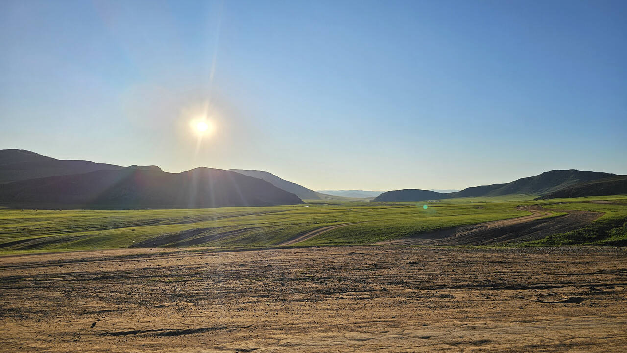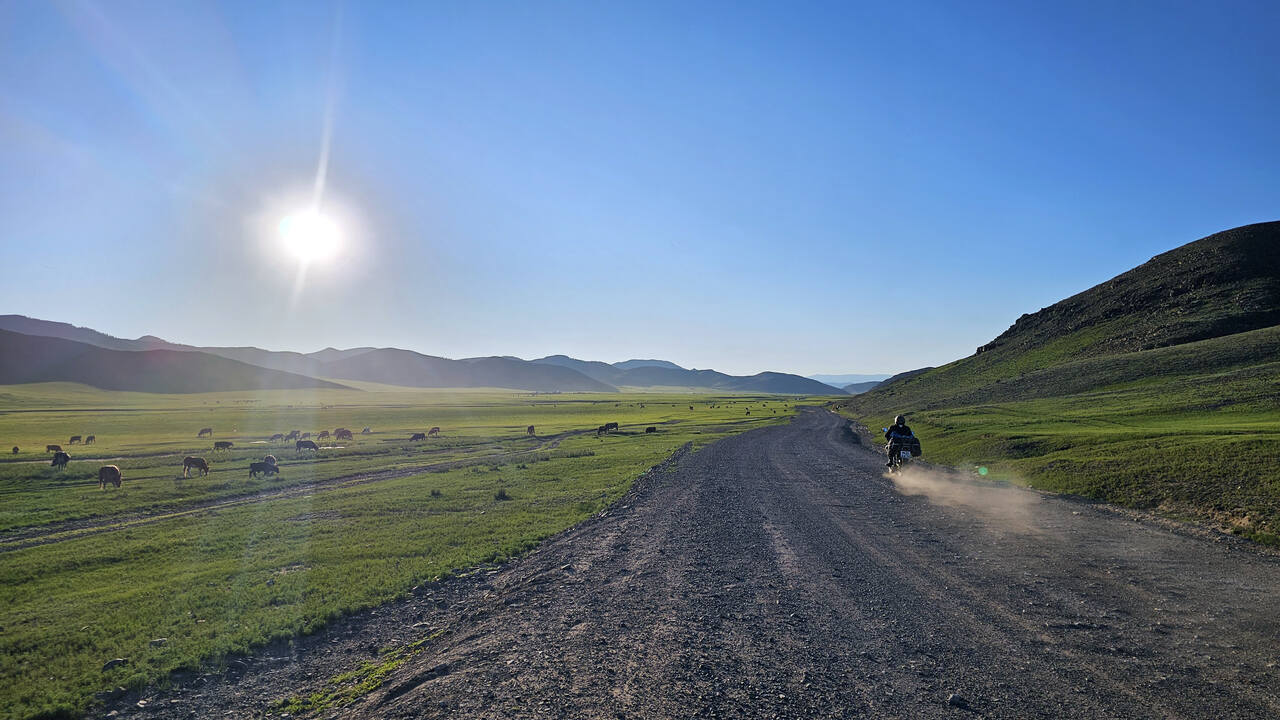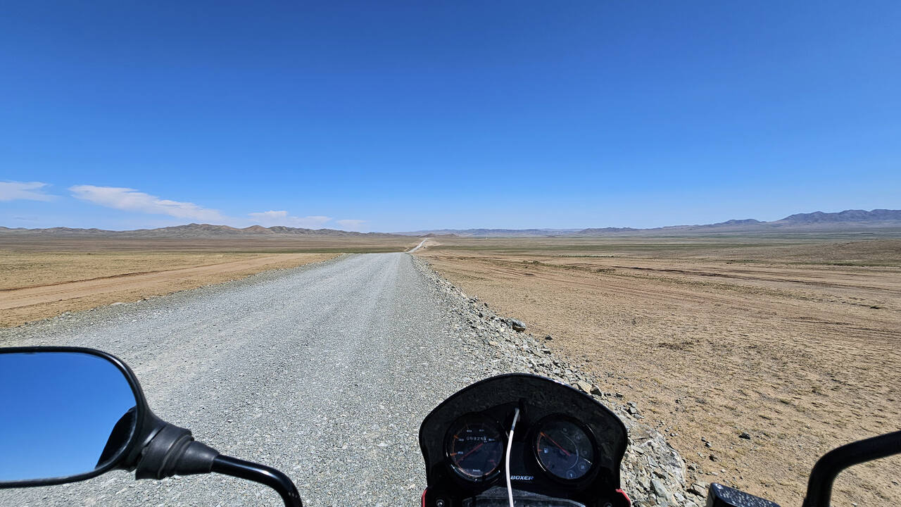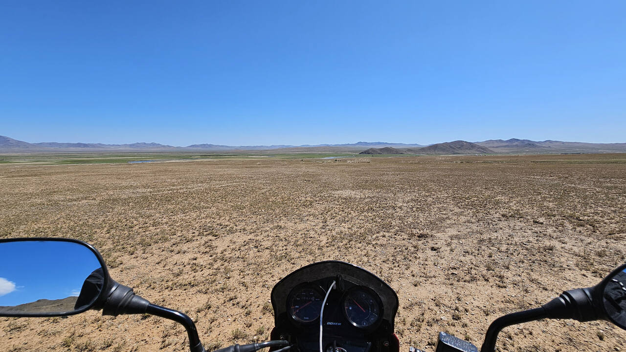 Перевалив через хребты, вкатываемся в огромную долину, на горизонте которой очень далеко у горизонта вздымаются очередные горные хребты. Долина вытянута на северо-запад. По центру – почти высохший приток главной реки страны. На другой стороне которого едва видится гравийная дорога, с которой мы вчера свернули. Приходится преодолевать эту долину поперек и искать брод через ручей. Сначала полевая дорога начинает исчезать, едва видимая, она упирается в стоянку пастухов, а дальше – ничего, петляем между кочек, потом преодолеваем небольшой брод и понемногу приближаемся к гравийке. Хорошо, что не было дождей, и мы с легкостью справляемся. Теперь наш путь лежит по федеральной грунтовке, которая местами разделяется веером на десятки путей, часть из которых сходятся обратно в одну, иногда вбирая в себя новые дороги с разных направлений. Причудливая сеть монгольских дорог.