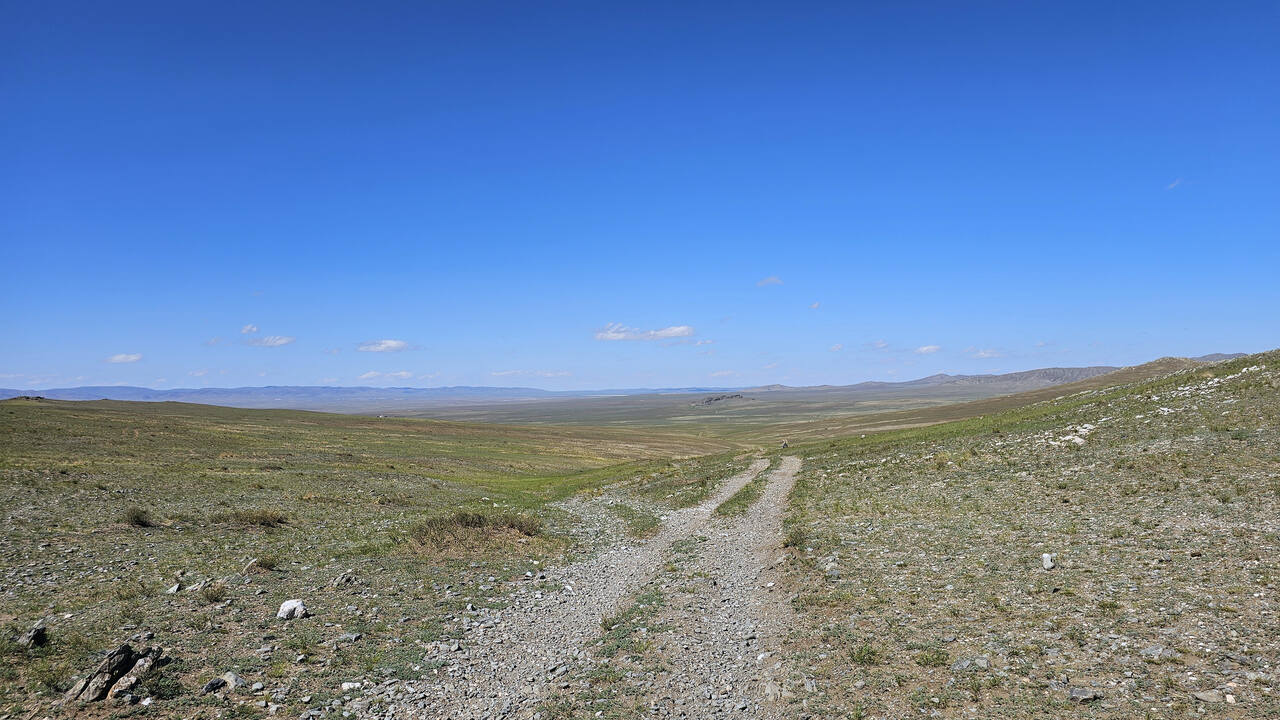 Дальше наш путь лежит через горный перевал. Полевые дороги превращаются в едва заметную накатанную колею по каменистой, и травяной поверхности. Полого поднимаемся вперед и вверх. Растительность понемногу сходит на нет, ветер становится все более сильным, но не холодает. Иногда останавливаемся, рассматриваем пейзажи и едем дальше.