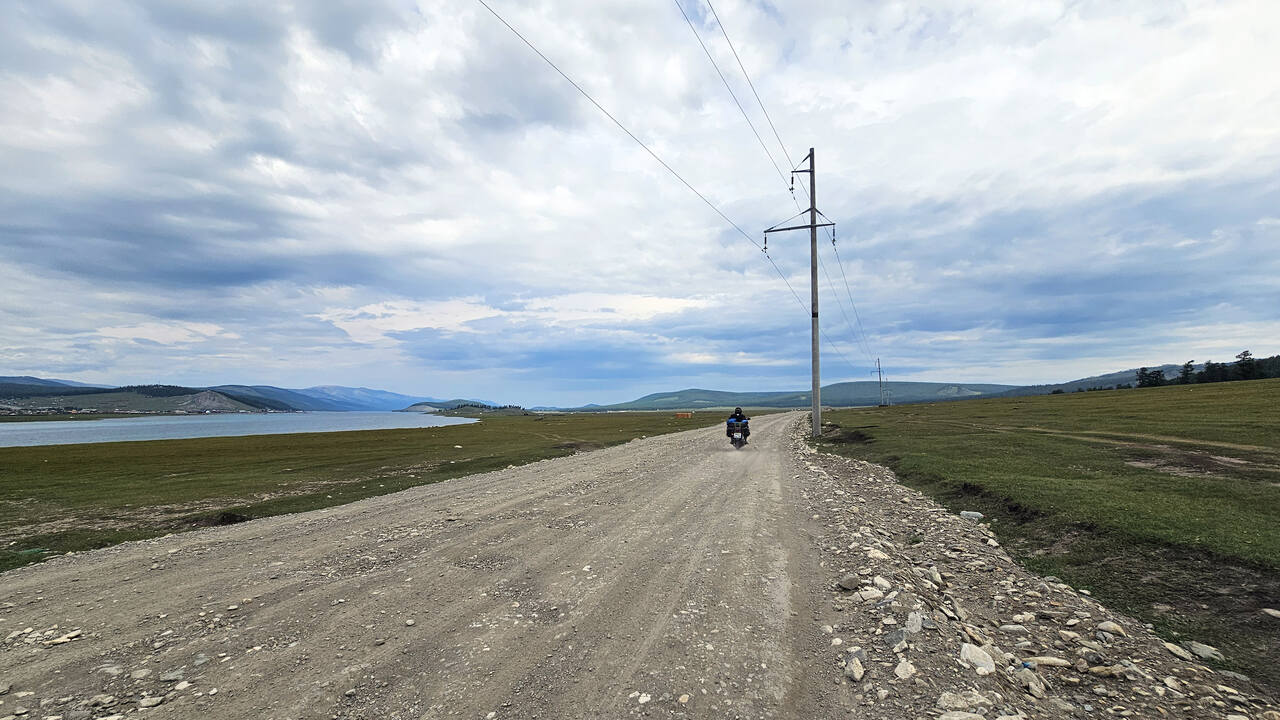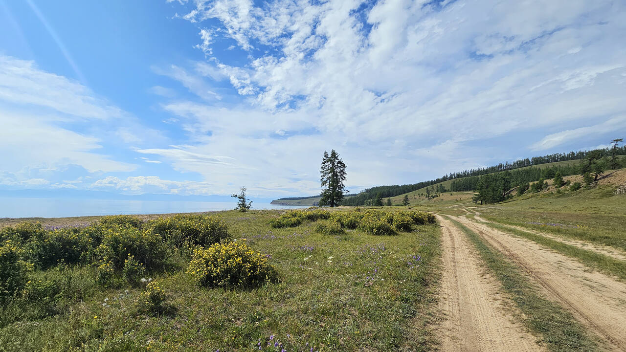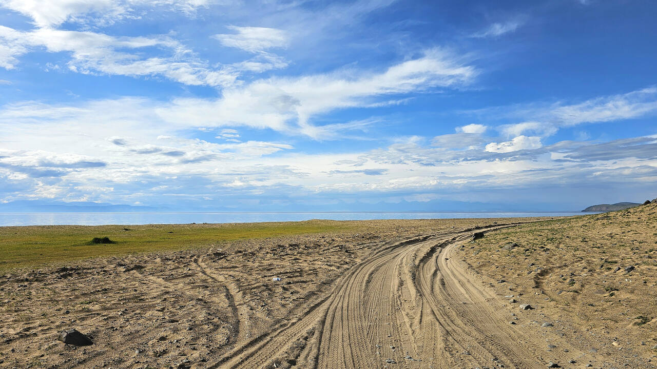 В самом начале дороги, на южной оконечности озера расположены турбазы, и какую-то часть побережья – около 20 километров дорога даже отсыпана крупным щебнем, но дальше дорога превращается в сеть полевых колей, причудливо извивающихся в попутном направлении, и можно выбирать, какой путь тебе по душе. Турбазы исчезают в зеркалах заднего вида, и мы остаемся наедине с природой. Погода благоволит путникам, где-то на юге льет дождь, впереди на севере тоже, а мы едем между стихиями. Периодически в просветах туч появляется солнце.
