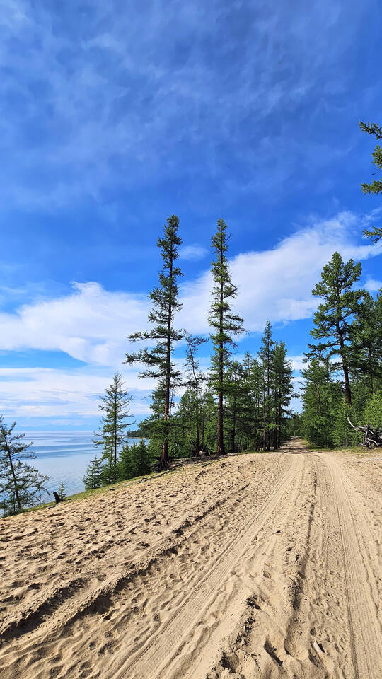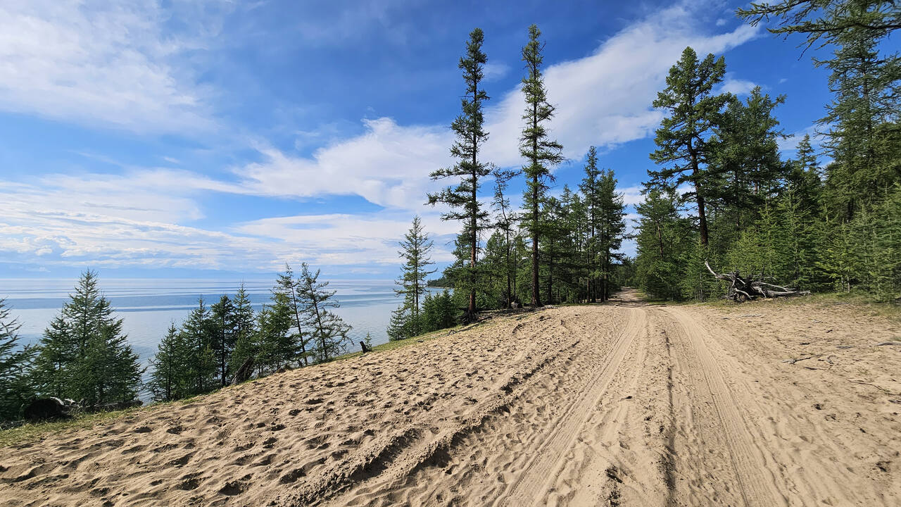 На другом участке пути встречаются глубокие мелкие как пыль пески. Есть более восточный объезд. Но в этот раз мы решаем ехать трудным путем – уж слишком там великолепная природа, чтобы ее пропускать. Песчаная дорога идет через прибрежный лиственичный лес с видами на озеро, а иногда спускается прямо к берегу, превращаясь в песчаные пляжи. По песку ехать трудно, маломощные мотоциклы с узкой дорожной резиной зарываются в песок. Местами приходится идти рядом с мотоциклом, а иногда на песчаных подъемах откровенно затаскивать мотоциклы вверх. Это очень выматывает. Пот льет рекой. Трудность преодоления этой части зависит от влажности песка. После дождей песок становится плотнее и редкие, но периодически проходящие машины (чаще всего это маршрутки Уазы буханки) его трамбуют – тогда, проезжая на мотоциклах нужно только ловить баланс. А в сухие периоды песок взрыхляется и становится сложно, как сейчас.