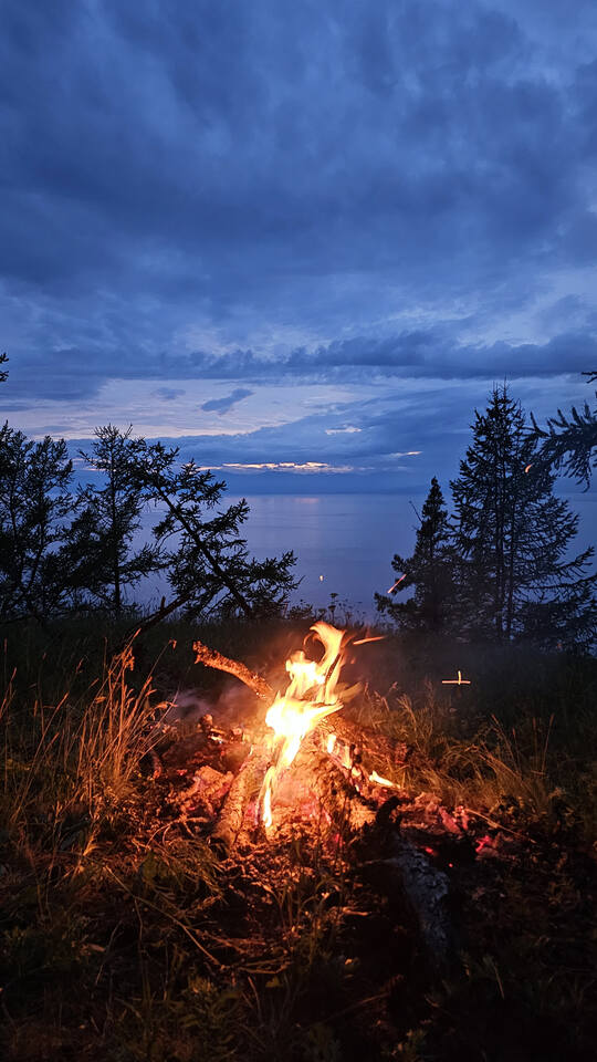 Готовим палатки, шашлык, ужин. Великолепный вид на могучий Байкал и горы, опоясывающие его с южной стороны. Разговоры до ночи. Иногда накрапывает дождь, но особого беспокойства это не вызывает. Спасает тент.